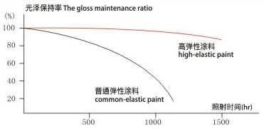 特性說明:★ 涂膜的高延伸率,具有彌蓋墻體裂縫的橋連能力,能防止雨水從裂縫進入墻體,起到墻面整體美觀的效果和防止混凝土結(jié)構(gòu)碳化的作用。 ★ 涂膜的分子結(jié)構(gòu)能有效阻隔水份,但允許水蒸汽的少量進出,起到防止又透氣的作用。 ★ 涂膜的光固化反應(yīng)而形成的核殼效應(yīng),能使涂膜表面形成致密而強韌的防污染層,完全克服了傳統(tǒng)彈性涂料容易污染和低壽命的劣點, ★ 添加特殊防菌劑,能長期防止霉菌及微生物的滋生。 產(chǎn)品特征:水溶性、彩色、單組份。 涂膜的伸延性: