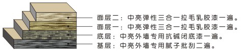 優(yōu)特性說明:★ 耐候性佳、保色好、抗水性,涂膜在高溫天氣不易回粘,達(dá)到防塵效果。 ★ 抗堿、防霉、防藻性佳、耐老化性、不粉化。 ★ 耐擦洗1000次以上。 產(chǎn)品特征:水性、啞光、彩色、單組份。 配套用漆: