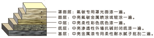 采用氟碳樹脂與閃光金屬漆粉制成的氟碳金屬漆,用噴涂輥涂而成信各色鋁塑板的金屬面效果,它主要用在需耐久性高的高檔外墻面裝飾上,漆膜堅韌,抗紫外線,防腐蝕性強,不沾灰,清洗保養(yǎng)非常方便,保護(hù)外墻面免受碳化,是高檔外墻裝飾的非常理想選材。